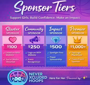 Never Xcluded Hoops (NXH) invites businesses and community partners to invest in the growth and confidence of the next generation of girl athletes. Sponsorship support directly fuels NXH and our partnered programs, helping us expand access, increase opportunity, and create more safe spaces for girls to shine—on and off the floor.